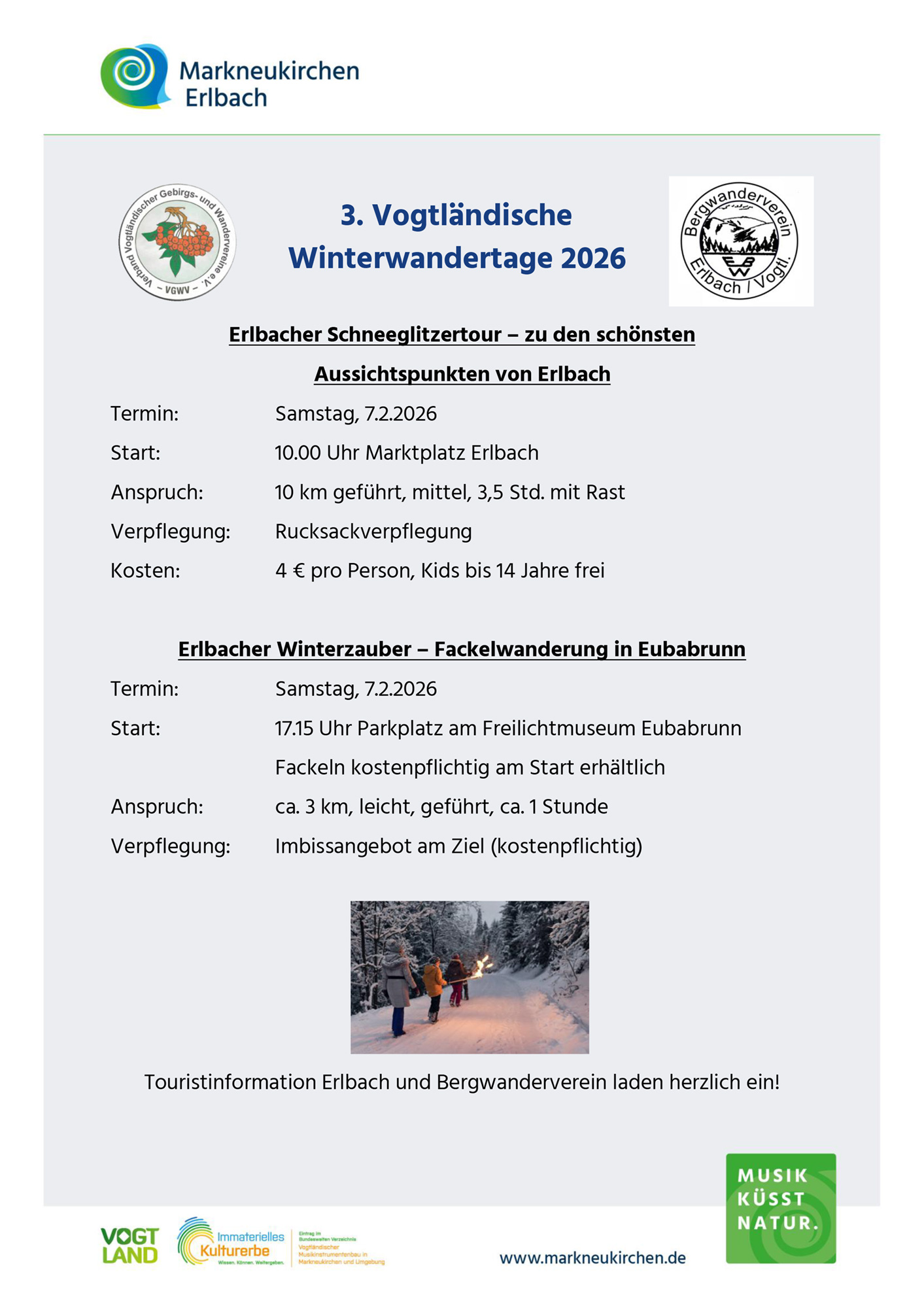 Die “Erlbacher Schneeglitzertour” startet um 10 Uhr auf dem Marktplatz – die Fackelwanderung 17:15 Uhr auf dem Parkplatz am Freilichtmuseum Eubabrunn.