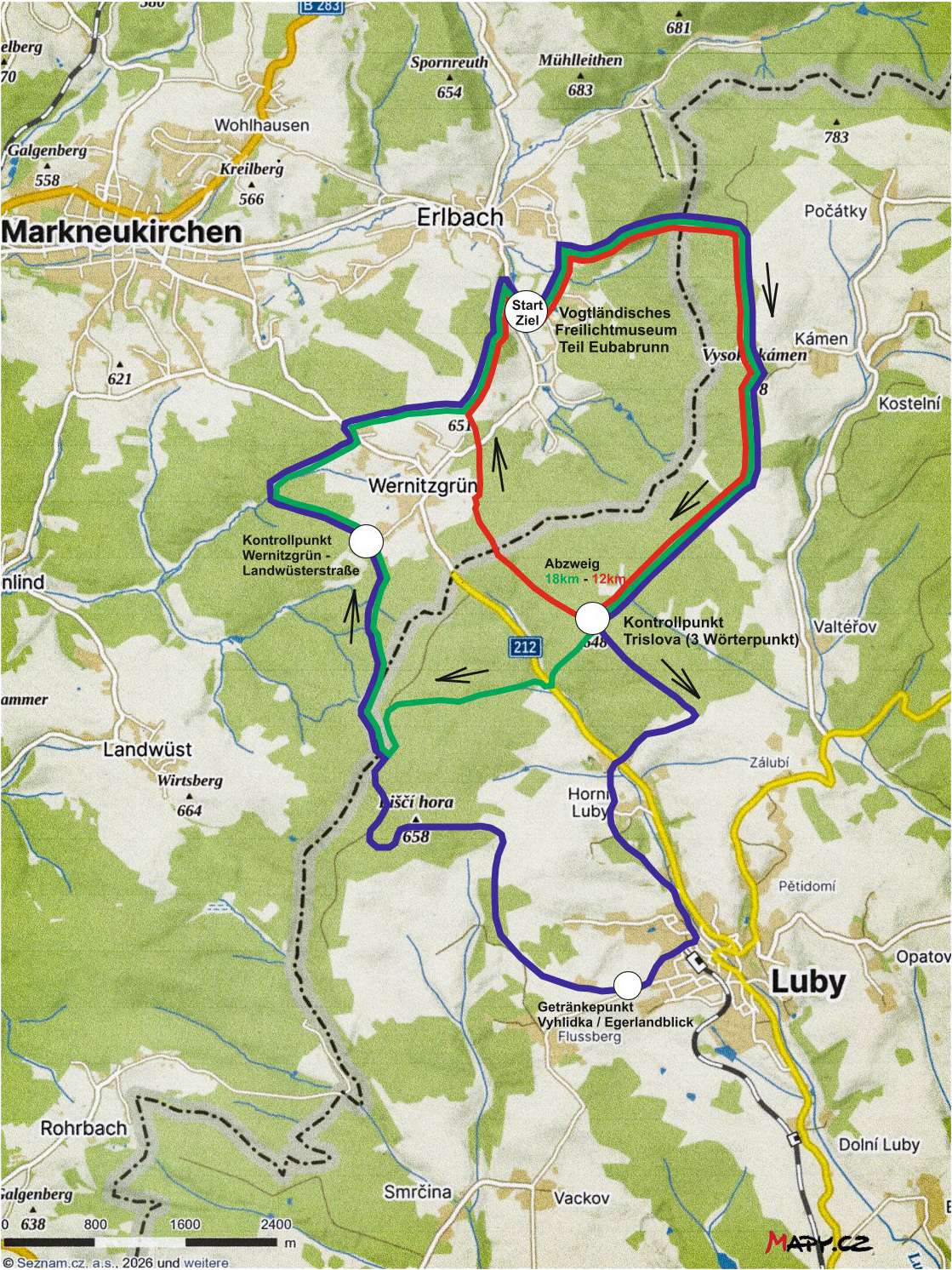 Eubabrunn – Wirtsgrund – Juliusstein (D/CZ) Kammweg (Hrebenovka) – Hoher Stein (Vysoký kámen) 774m NN – KontrPkt. 3Wörter (Tříslová) – Schönbach (Luby) – Fuchsberg (Liščí hora) – (CZ/D) – Streitwaldweg – Wernitzgrün – Bärenwinkel – Inspektorweg – Schloßpenzel – Galgenbergaussicht – Eubabrunner Straße – Ziel im Freilichtmuseum